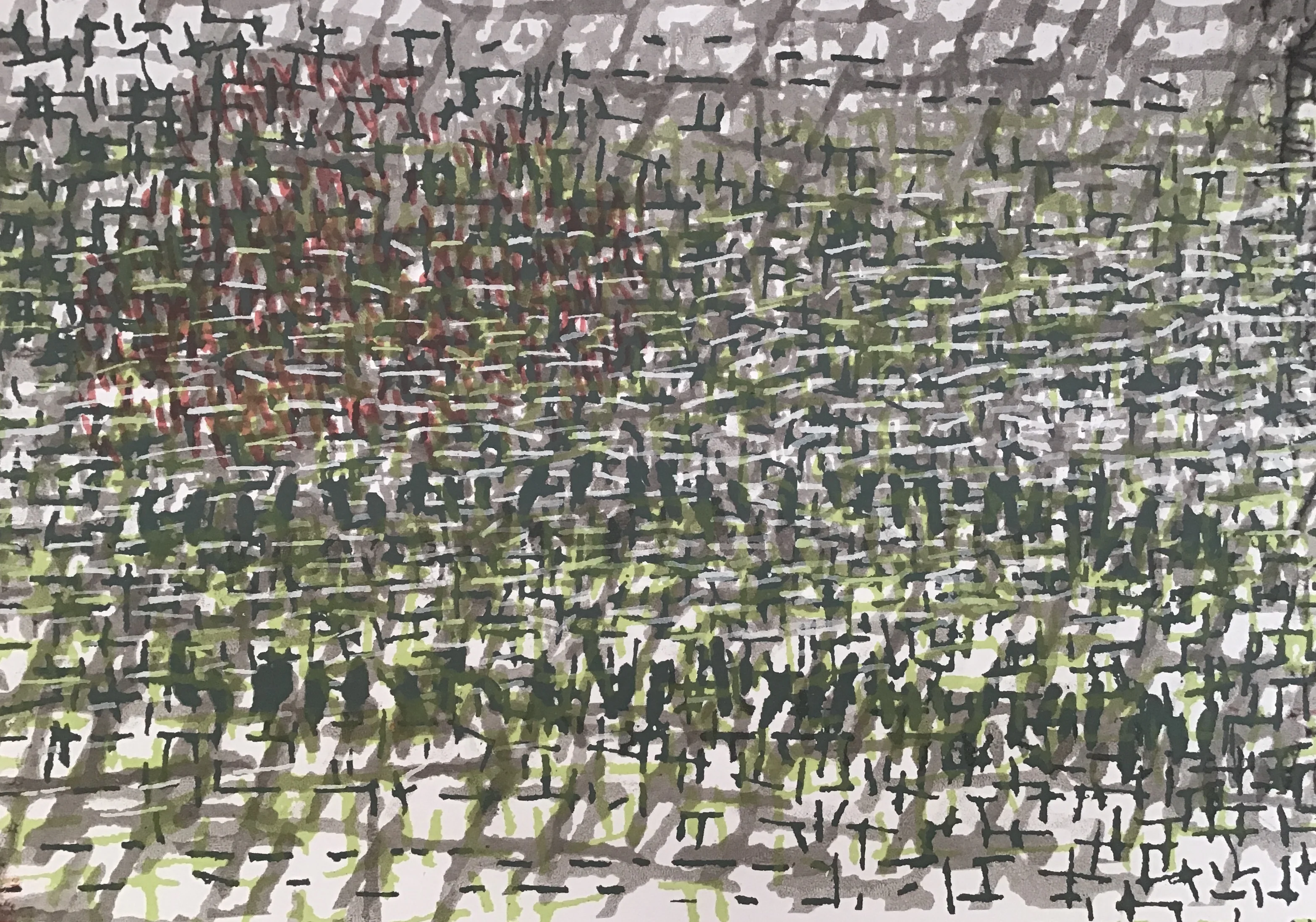Stehotisky vznikají kombinací ruční výšivky, strojového šití a sítotisku. Vrstvením a skládáním vznikají abstraktní a krajinné kompozice.